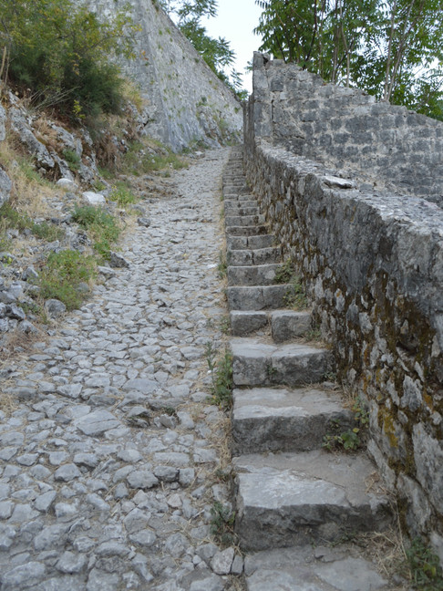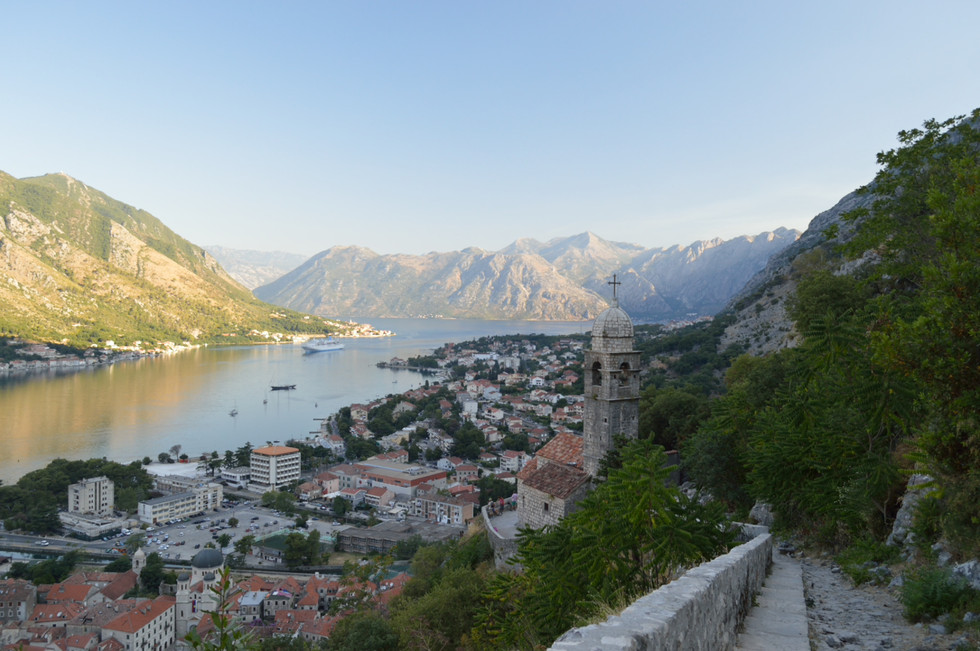 Żeby uniknąć intensywnego słońca wybraliśmy się na podbój twierdzy Kotorskiej o 7 rano. Miasto jeszcze było pogrążone w błogim śnie, kelnerzy dopiero otwierali okiennice kawiarni, a sprzedawcy rozkładali swoje towary. Po wcześniejszych wskazówkach udało nam się odnaleźć bramę północną, za która znajduje się jeden ze szlaków prowadzących przez mury obronne aż na szczyt twierdzy. Był to idealny czas gdyż słonce jeszcze nie zdarzyło w pełni wzejść, dzięki czemu spacer na szczyt był bardzo przyjemny.